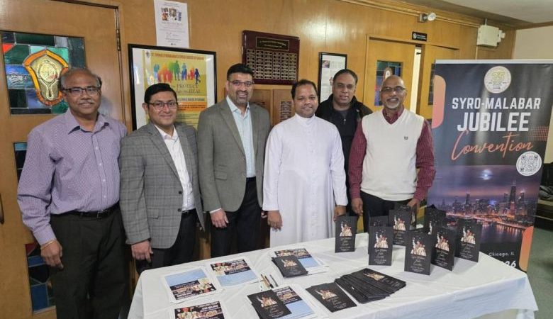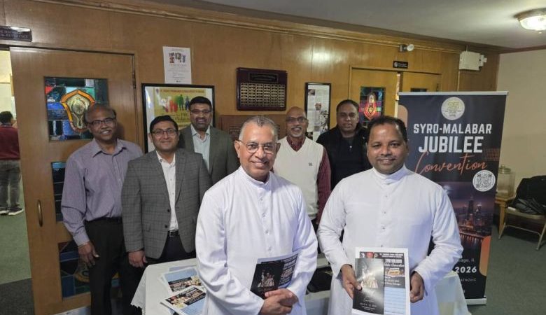 ചിക്കാഗോ: അമേരിക്കയിലെ സീറോ മലബാർ രൂപതയുടെ സിൽവർ ജൂബിലി ആഘോഷങ്ങളുടെ ഭാഗമായി 2026 ജൂലൈ 9 മുതൽ 12 വരെ നടക്കുന്ന ദേശീയ കൺവെൻഷന്റെ പ്രചാരണത്തിനും കിക്കോഫിനുമായി ജൂബിലി കൺവീനർ ഫാ.ജോൺ മേലേപ്പുറത്തിനോടൊപ്പം സെൻ്റ് തോമസ് സീറോ മലബാർ ദേവാലയം സന്ദർശിച്ച കൺവെൻഷൻ ടീമിന് സ്നേഹപൂർവ്വമായ സ്വീകരണം ഇടവകാംഗങ്ങൾ നൽകി.