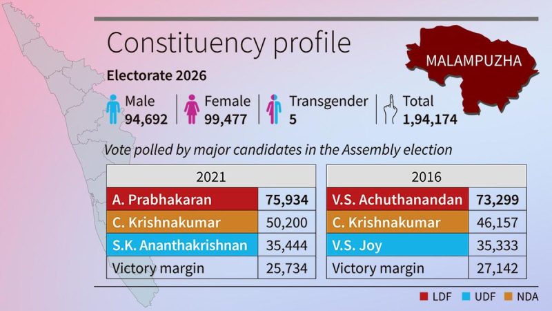 പാലക്കാട്: ഇടതുപക്ഷ കോട്ടയായ മലമ്പുഴ മണ്ഡലത്തിൽ ബിജെപി വ്യക്തമായ മുന്നേറ്റം നടത്തുന്നുണ്ടെങ്കിലും, മിക്ക പഞ്ചായത്തുകളിലും ഇടതുപക്ഷ ജനാധിപത്യ മുന്നണി ഇപ്പോഴും ആധിപത്യം പുലർത്തുന്നുകയാണ്. എൽഡിഎഫിന്റെ എ. പ്രഭാകരനും ബിജെപിയുടെ സി. കൃഷ്ണകുമാറും തമ്മിലുള്ള പോരാട്ടമാണ് മണ്ഡലത്തിൽ നടക്കുന്നത്. വിഎസ് അച്യുതാനന്ദന്റെ മുൻ പേഴ്സണൽ അസിസ്റ്റന്റ് എ. സുരേഷാണ് യുഡിഎഫ് സ്ഥാനാർത്ഥി.
