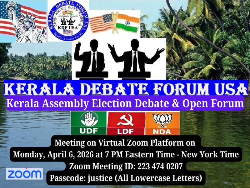 ഹ്യൂസ്റ്റൺ: ചൂടേറിയ കേരളാ അസംബ്ലി തെരഞ്ഞെടുപ്പ് പ്രചാരണങ്ങൾ തിരുതകൃതിയായി നടക്കുന്ന ഈ അവസരത്തിൽ, താല്പര്യമുള്ള അമേരിക്കൻ മലയാളികൾക്കായി കേരള ഡിബേറ്റ് ഫോറം യു എസ് എ, ആഭിമുഖ്യത്തിൽ, വിജ്ഞാനപ്രദവും രാഷ്ട്രീയ ബോധവൽക്കരണത്തിന് ഉതകുന്നതുമായ ഇലക്ഷൻ (സും) ഡിബേറ്റ്, ഏപ്രിൽ 6, 2026 തിങ്കൾ വൈകുന്നേരം 7 മണി (ഈസ്റ്റേൺ സ്റ്റാൻഡേർഡ് ടൈം – ന്യൂയോർക്ക് ടൈം) സംഘടിപ്പിക്കുന്നു.