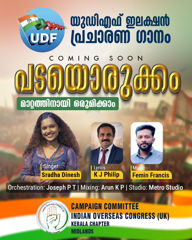 മിഡ്ലാന്ഡ്സ്: കേരള നിയമസഭ തെരഞ്ഞെടുപ്പിനെ മുന്നിൽക്കണ്ട് യു ഡി എഫ് സ്ഥാനാർഥികളുടെ വിജയത്തിനായി ഇന്ത്യൻ ഓവർസീസ് കോൺഗ്രസ് (യുകെ) കേരള ചാപ്റ്റർ മിഡ്ലാന്ഡ്സ് ക്യാമ്പയിൻ കമ്മിറ്റിയുടെ നേതൃത്വത്തിൽ പ്രചാരണ പ്രവർത്തനങ്ങൾ ശക്തമാക്കുന്നു. ഇതിന്റെ ഭാഗമായി ഏപ്രിൽ 2, വ്യാഴാഴ്ച യു ഡി എഫ് പ്രചാരണ വീഡിയോ ഗാനം സമൂഹമാധ്യമങ്ങൾ മുഖേന പുറത്തിറക്കുമെന്ന് കമ്മിറ്റി അറിയിച്ചു.