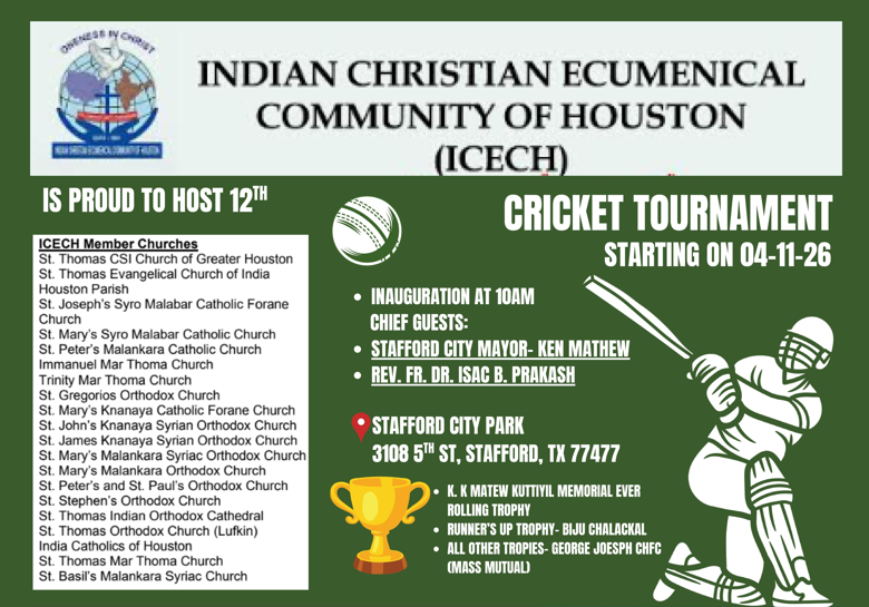ഇന്ത്യൻ ക്രിസ്ത്യൻ എക്യൂമെനിക്കൽ കമ്മ്യൂണിറ്റി ഓഫ് ഹൂസ്റ്റൺ (ICECH) ആഭിമുഖ്യത്തിൽ സംഘടിപ്പിക്കുന്ന 12-ാമത് ക്രിക്കറ്റ് ടൂർണമെന്റിന് ഏപ്രിൽ 11-ന് ശനിയാഴ്ച തുടക്കം കുറിക്കും.
