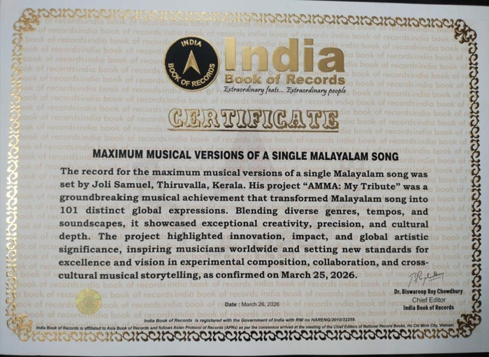 ഡോ. ബിശ്വറൂപ്റോയ് ചൗധരി ചീഫ് എഡിറ്റർ ആയുള്ള ഇന്ത്യ ബുക്ക് ഓഫ് റെക്കോർഡ് ജോളിയുടെ സംഗീതത്തിലുള്ള അപൂവ്വമായ ഈ നേട്ടം സ്ഥിതീകരിച്ചു കൊണ്ടുള്ള സർട്ടിഫിക്കറ്റ് 2026 മാർച്ച് 25 നു നൽകിയിട്ടുണ്ട്.