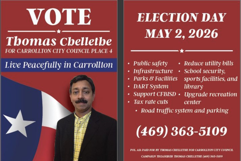 കരോൾട്ടൺ (ടെക്സസ്): അമേരിക്കയിലെ കാരൾട്ടൺ സിറ്റി കൗൺസിലിലേക്ക് നടക്കുന്ന തിരഞ്ഞെടുപ്പിൽ പ്രമുഖ മലയാളി പൊതുപ്രവർത്തകൻ തോമസ് ചെള്ളേത്ത് മത്സരിക്കുന്നു. ഇന്ത്യൻ ക്രീക്ക് ഹോം ഓണേഴ്സ് അസോസിയേഷൻ വൈസ് പ്രസിഡന്റ് എന്ന നിലയിലും വിവിധ സാമൂഹിക സംഘടനകളിലെ സജീവ സാന്നിധ്യമായും ശ്രദ്ധേയനായ അദ്ദേഹം, നഗരത്തിന്റെ വിപുലമായ വികസന പദ്ധതികൾ മുൻനിർത്തിയാണ് ജനങ്ങളെ സമീപിക്കുന്നത്.