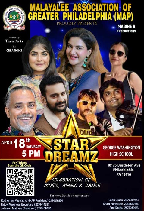 ഫിലാഡൽഫിയ:മലയാളി സമൂഹത്തിന്റെ സാംസ്കാരിക പൈതൃകം ഉയർത്തിപ്പിടിക്കുന്നതിൽ പ്രമുഖ സ്ഥാനത്ത് നിൽക്കുന്ന മലയാളി അസോസിയേഷൻ ഓഫ് ഗ്രേറ്റർ ഫിലാഡൽഫിയയുടെ ആഭിമുഖ്യത്തിൽ നടത്തുന്ന സ്റ്റാർ ഡ്രീംസ് സ്റ്റേജ് ഷോ 2026 ന്റെ ഒരുക്കങ്ങൾ പൂർത്തിയായി വരുന്നു .ഏപ്രിൽ 18 ശനിയാഴ്ച് അഞ്ചുമണിക്ക് ജോർജ് വാഷിംഗ്ടൺ ഹൈസ്കൂൾ ഓഡിറ്റോറിയത്തിൽ ഹണി റോസും കൂട്ടരും അവതരിപ്പിക്കുന്ന വിസ്മയകരമായ ഈ കലാവിരുന്നിൽ പങ്കുചേരാൻ ഹൃദയം നിറഞ്ഞ ക്ഷണം അറിയിക്കുന്നു
