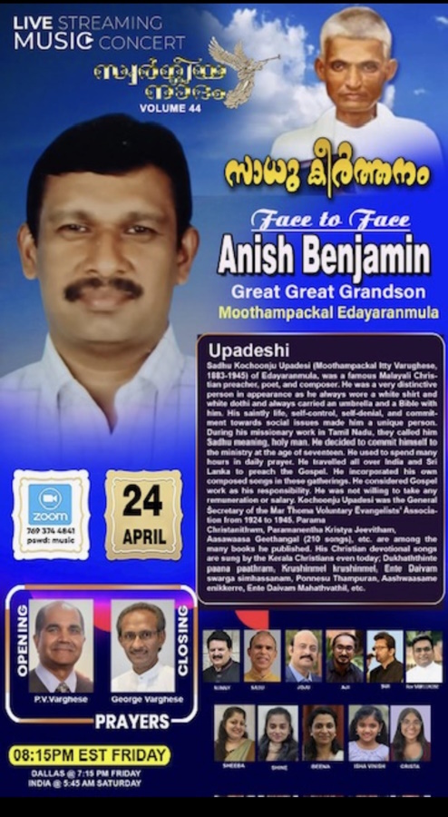 ഡാളസ് : പ്രശസ്ത ക്രൈസ്തവ പ്രസംഗകനും ഗാനരചയിതാവുമായിരുന്ന സാധു കൊച്ചുഞ്ഞ് ഉപദേശിയുടെ സ്മരണാർത്ഥം “സ്വർഗീയ നാദം” സംഘടിപ്പിക്കുന്ന ‘സാധു കീർത്തനം’ ലൈവ് സ്ട്രീമിംഗ് മ്യൂസിക് കൺസേർട്ട് ഏപ്രിൽ 24 വെള്ളിയാഴ്ച നടക്കും. സാധു കൊച്ചുഞ്ഞ് ഉപദേശിയുടെ (മൂത്തമ്പാക്കൽ ഇടയാറന്മുള) കൊച്ചുമകന്റെ മകനായ അനീഷ് ബെഞ്ചമിൻ ആണ് ഈ ‘ഫേസ് ടു ഫേസ്’ പരിപാടിയിൽ മുഖ്യാതിഥിയായി എത്തുന്നത്.