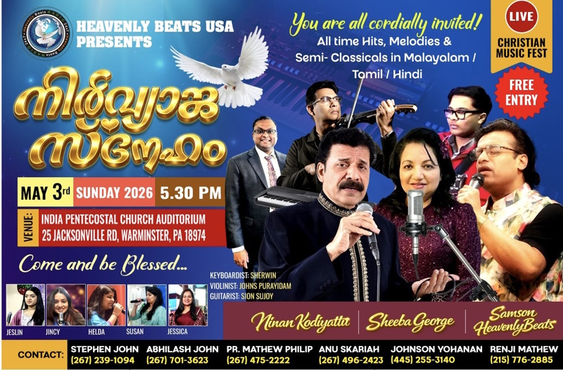ഫിലഡൽഫിയ: ഹെവന്‍‌ലി ബീറ്റ്സ് യു‌എസ്‌എയുടെ ആഭിമുഖ്യത്തിൽ ‘നിർവ്യാജ സ്നേഹം’ എന്ന ക്രിസ്തീയ സംഗീതവിരുന്ന് മെയ് 3 ഞായറാഴ്ച വൈകിട്ട് 5.30ന് വാർമിൻസ്റ്ററിലെ India Pentecostal Church Auditorium-ൽ (25 Jacksonville Rd, Warminster, PA 18974) നടക്കും.