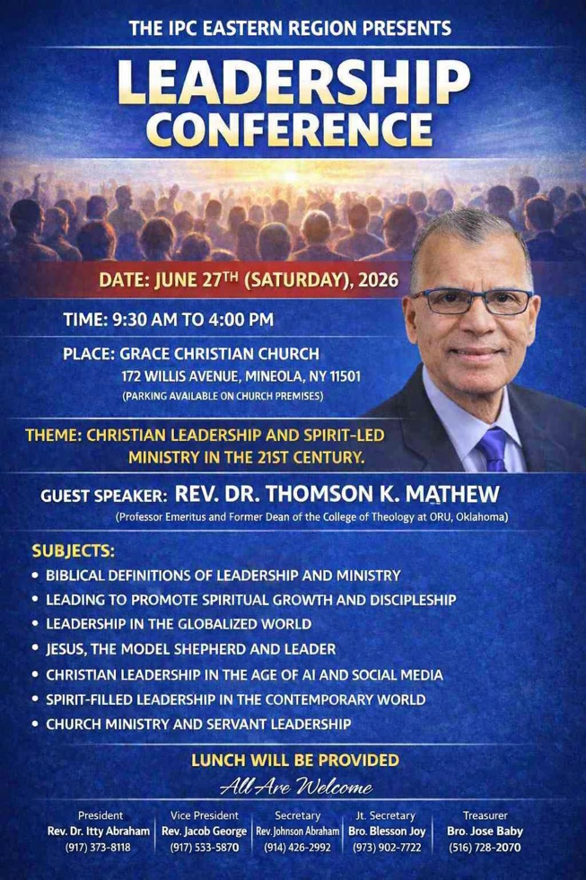 ന്യൂയോർക്ക്: ഇന്ത്യ പെന്തക്കോസ്ത് ദൈവസഭ നോർത്ത് അമേരിക്കൻ ഈസ്റ്റേൺ റീജിയന്റെ ആഭിമുഖ്യത്തിൽ ഏകദിന സെമിനാർ ജൂൺ 27 ശനി രാവിലെ 9:30 മുതൽ വൈകുന്നേരം 4:00 വരെ ഗ്രേസ് ക്രിസ്ത്യൻ ചർച്ചിൽ വെച്ച് നടത്തപ്പെടും. (172 വില്ലിസ് അവന്യൂ, മിനിയോള, ന്യൂയോർക്ക് 11501 )