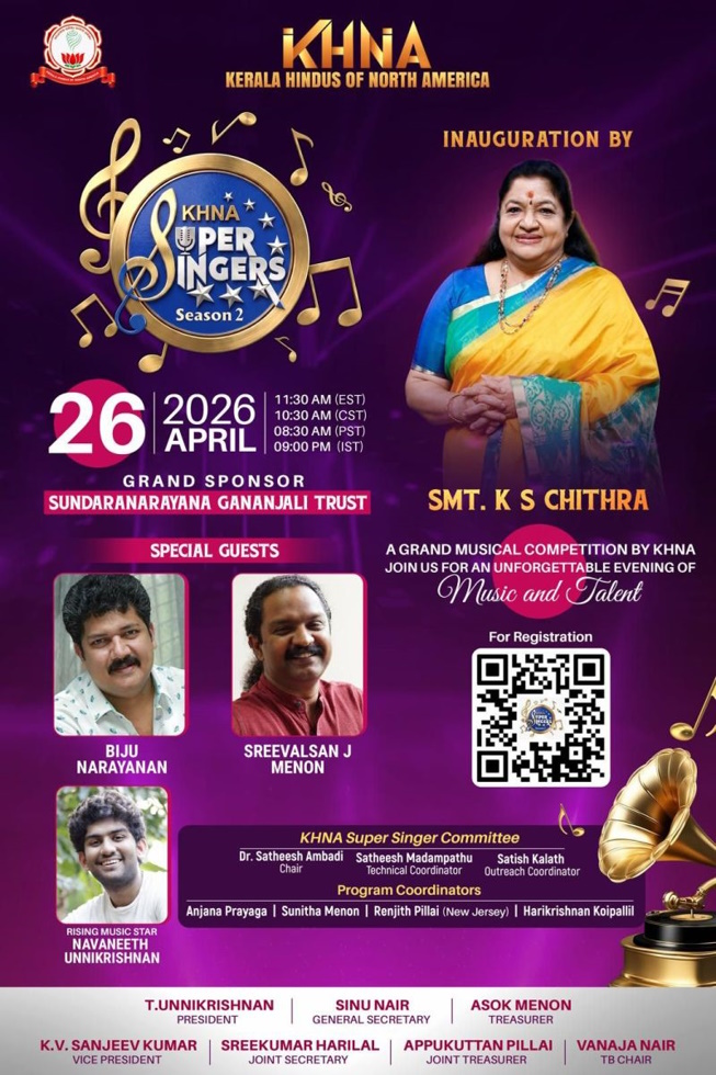 ഫ്ലോറിഡ: കേരള ഹിന്ദൂസ് ഓഫ് നോർത്ത് അമേരിക്ക (KHNA) സംഘടിപ്പിക്കുന്ന KHNA Super Singers – Season 2 എന്ന സംഗീത മത്സര പരിപാടിക്ക് ഏപ്രിൽ 26-ന് (11:30 AM EST) തിരശ്ശീല ഉയരും. തെന്നിന്ത്യന്‍ വാനമ്പാടി എന്നു വിശേഷിപ്പിക്കുന്ന പ്രശസ്ത ഗായിക കെ എസ് ചിത്ര Zoom-ൽ നടക്കുന്ന ഓൺലൈൻ ചടങ്ങ് ഉത്ഘാടനം ചെയ്യും.