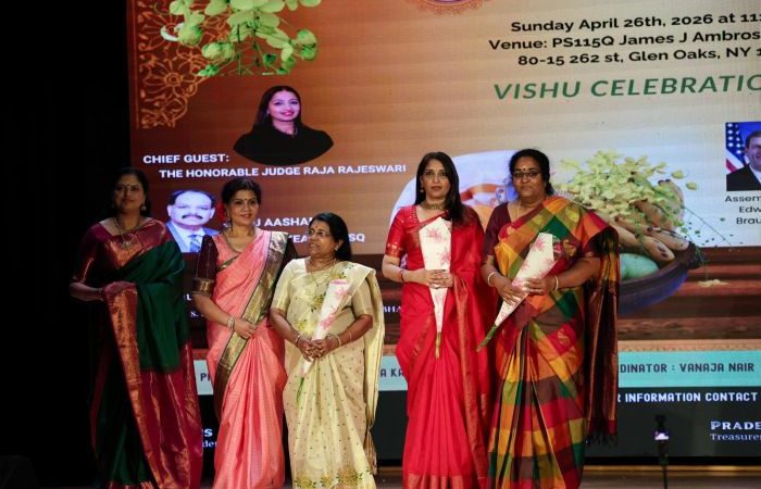 സെക്രട്ടറി രഘുവരൻ നായരുടെ സ്വാഗത പ്രസംഗത്തിനു ശേഷം ബോർഡ് ഓഫ് ട്രസ്റ്റി ചെയർവുമൺ ശ്രീമതി വനജ നായർ വിഷുവിന്റെ പ്രാധാന്യത്തെക്കുറിച്ചു സംസാരിച്ചു. അഡ്വ. വിനോദ് കെയാർകെ വിഷു സന്ദേശം നല്കി. മുഖ്യാതിഥി ജഡ്ജി രാജ രാജേശ്വരി, ന്യൂയോർക്ക് സ്റ്റേറ്റ് അസംബ്ലിമാൻ എഡ്വേര്ഡ് സി ബ്രോൺസ്റ്റീൻ എന്നിവർ ആശംസകൾ നേർന്ന് സംസാരിച്ചു.