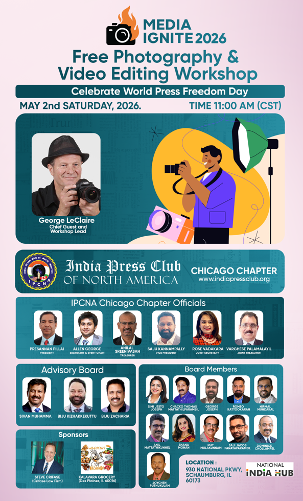 ഷിക്കാഗോ: ലോക മാധ്യമ സ്വാതന്ത്ര്യ ദിനാഘോഷങ്ങളുടെ ഭാഗമായി, ഇന്ത്യ പ്രസ് ക്ലബ് ഓഫ് നോർത്ത് അമേരിക്ക (IPCNA) ഷിക്കാഗോ ചാപ്റ്റർ സംഘടിപ്പിക്കുന്ന സൗജന്യ മീഡിയ പരിശീലന വർക്ക്ഷോപ്പ് ‘മീഡിയ ഇഗ്നൈറ്റ് 2026’ മെയ് 2-ാം തീയതി ശനിയാഴ്ച രാവിലെ 11 മണിക്ക് ഷാംബർഗ്, ഇലിനോയിയിലെ നാഷണൽ ഇന്ത്യ ഹബ്ബിൽ നടക്കും.