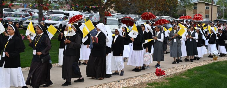വിശുദ്ധ കുർബാനയ്ക്ക് ശേഷം സന്യാസിനികളെ ആദരിക്കുന്ന വർണ്ണാഭമായ സാംസ്കാരിക ഘോഷയാത്ര നടന്നു. മുത്തുക്കുടകളുടെയും ചെണ്ടമേളത്തിന്റെയും അകമ്പടിയോടെ നീങ്ങിയ ഈ ഘോഷയാത്ര, അവർക്ക് വേദിയിലേക്ക് സ്നേഹാദരവുകളോടെയുള്ള ഊഷ്മളമായ സ്വീകരണമാണ് നൽകിയത്.