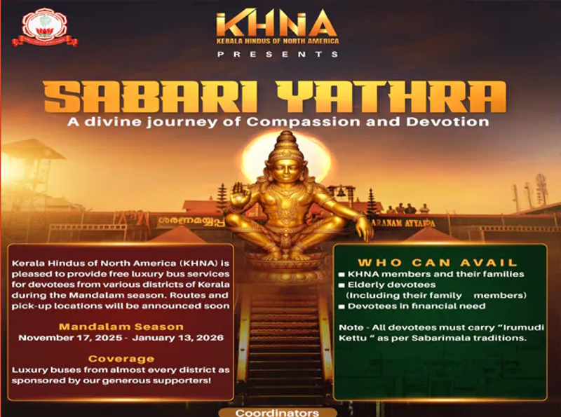 ഫ്ലോറിഡ :കേരള ഹിന്ദൂസ് ഓഫ് നോർത്ത് അമേരിക്ക (കെ.എച്ച്.എൻ.എ) മണ്ഡല കാലത്ത് കേരളത്തിലെ വിവിധ ജില്ലകളിൽ നിന്നുള്ള ഭക്തർക്കായി സൗജന്യ ബസ് സർവീസ് ഒരുക്കുന്നു. അമേരിക്കൻ മലയാളി ഹിന്ദുക്കളുടെ വിശ്വാസവും ഐക്യവും പ്രതിഫലിപ്പിക്കുന്ന ഈ “ശബരീ യാത്ര”, ഭക്തിയുടെയും സമർപ്പണത്തിൻ്റെയും പ്രതീകമായി മാറുകയാണ്. ഉദാരമനസ്കരായ സ്പോൺസർമാരുടെ പിന്തുണയോടെ നടപ്പിലാക്കുന്ന “ശബരീ യാത്ര ” നവംബർ 17 മുതൽ ജനുവരി 13 വരെയുള്ള കാലയളവിൽ ലഭ്യമാകും. ഈ പദ്ധതിയുടെ സൗജന്യ സേവനം കെ.എച്ച്.എൻ.എ അംഗങ്ങൾക്കും അവരുടെ കുടുംബാംഗങ്ങൾക്കും, അറുപതു വയസ്സിനു മുകളിലുള്ള മുതിർന്ന പൗരന്മാർക്കും, സാമ്പത്തിക ബുദ്ധിമുട്ട് നേരിടുന്ന ഭക്തർക്കും വേണ്ടിയാണു ഒരുക്കിയിട്ടുള്ളത്. ബസ്സുകൾ പുറപ്പെടുന്ന സ്ഥലങ്ങളും സമയക്രമവും ഷെഡ്യൂൾ ചെയ്യുന്ന മുറയ്ക്ക് പ്രസിദ്ധീകരിക്കും.കെ.എച്ച്.എൻ.എ ട്രഷറർ അശോക് മേനോൻ സ്പോൺസർ ചെയ്യുന്ന ബസ്, നവംബർ 20-ന് രാവിലെ 8 മണിക്ക് ചോറ്റാനിക്കര ക്ഷേത്രപരിസരത്തുനിന്ന് പുറപ്പെടും. ഇരുമുടി കെട്ടു നിറച്ചു…