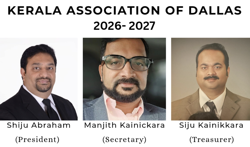 ഡാളസ് : ഡാളസ് കേന്ദ്രീകരിച്ചു പ്രവർത്തിക്കുന്ന പ്രവാസി മലയാളികളുടെ ആദ്യകാലസംഘടനയും അമേരിക്കയിൽ മുൻനിര സംഘടനകളിൽ ഒന്നുമായ കേരള അസോസിയേഷൻ ഓഫ് ഡാളസ് 2026-2027 കാലയളവിലേക്കുള്ള ഭാരവാഹികളെ തെരെഞ്ഞെടുത്തു. 1976 ൽ സ്ഥാപിതമായ ഈ അസ്സോസിയേഷന് നിലവില് 1500 ൽ പരം അംഗങ്ങളുണ്ട്. തിരഞ്ഞെടുപ്പില് മത്സരത്തിനായി പലരും നാമനിര്ദ്ദേശ പത്രിക സമര്പ്പിച്ചെങ്കിലും, ഇന്ത്യൻ കൾചറൽ ആൻഡ് എഡ്യൂക്കേഷൻ സെന്ററിന്റെയും, കേരള അസോസിയേഷന്റെയും പൊതു മീറ്റിംഗിലൂടെ തെരഞ്ഞെടുപ്പ് ഒഴിവാക്കി കൊണ്ടു പുതിയ ഭാരവാഹികളെ തെരെഞ്ഞെടുക്കുകയാണുണ്ടായത്. ഷിജു എബ്രഹാം പ്രസിഡന്റായും, മഞ്ജിത്ത് കൈനിക്കര സെക്രട്ടറിയായും, സിജു കൈനിക്കര ട്രഷറെറായും രൂപീകരിച്ച ഭാരവാഹികളെ കൂടാതെ 15 അംഗ കമ്മറ്റിയെയും തെരഞ്ഞെടുത്തു. ജനുവരിയിൽ ആഘോഷിക്കുന്ന ക്രിസ്തുമസ് പുതുവത്സര പരിപാടിയിൽ പുതിയ ഭാരവാഹികൾ ചുമതലയേൽക്കും. പ്രസ്തുത പരിപാടിയിൽ സുവർണ്ണ ജൂബിലി ആഘോഷ ഉത്ഘാടനവും നടത്തുമെന്ന് നിലവിലെ ഭാരവാഹികൾ അറിയിച്ചു.