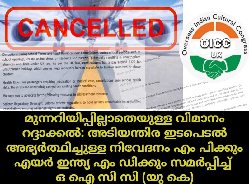 മുന്നറിയിപ്പില്ലാതെയുള്ള വിമാനം റദ്ദാക്കൽ: അടിയന്തിര ഇടപെടൽ അഭ്യർത്ഥിച്ചുള്ള നിവേദനം എം പിക്കും എയർ ഇന്ത്യ എം ഡിക്കും സമർപ്പിച്ച് ഒ ഐ സി സി (യു കെ)