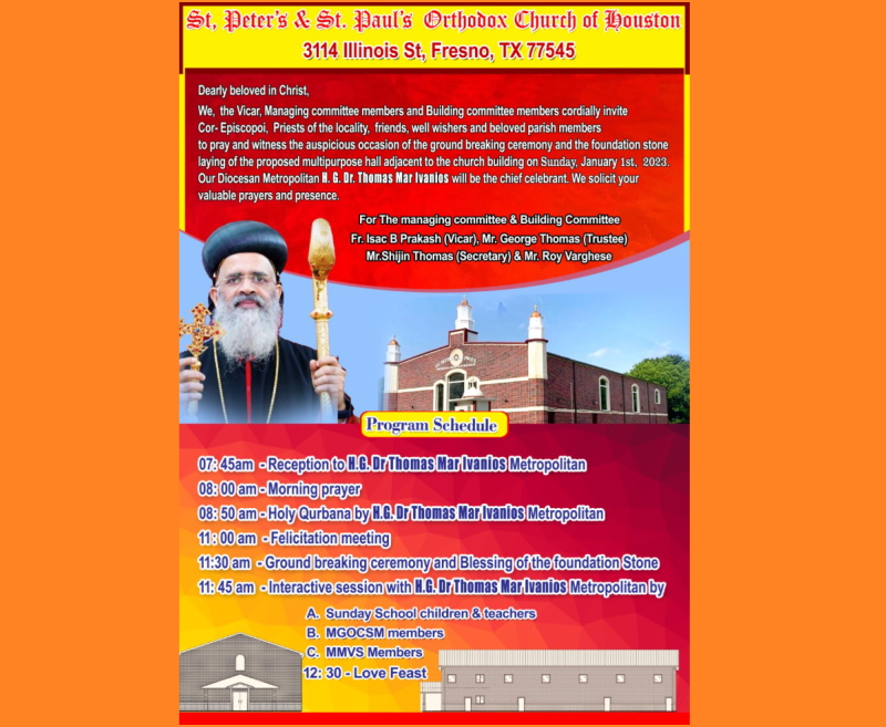 ഹൂസ്റ്റൺ: ഹൂസ്റ്റൺ സെന്റ് പീറ്റേഴ്സ് ആൻഡ് സെന്റ് പോൾസ് ഓർത്തഡോൿസ് ഇടവകകയ്ക്കു വേണ്ടി പുതുതായി നിർമ്മാണം നടത്തുന്ന മൾട്ടി പർപ്പസ് ഹാളിന്റെ ഗ്രൗണ്ട് ബ്രേക്കിംഗ് സെറിമണിയും ശിലാസ്ഥാപനവും മലങ്കര ഓർത്തഡോൿസ് സഭ സൗത്ത് വെസ്റ്റ് ഭദ്രാസനാധിപൻ അഭിവന്ദ്യ ഡോ.തോമസ് മാർ ഈവാനിയോസ് മെത്രാപോലീത്താ 2023 ജനുവരി 1 നു ഞായറാഴ്ച വിശുദ്ധ കുർബാനയ്ക്കു ശേഷം നിർവഹിക്കും. രാവിലെ 7.45 ന് ദേവാലയാങ്കണത്തിൽ എത്തിച്ചേരുന്ന മെത്രാപ്പോലീത്തയെ ഇടവകാംഗങ്ങൾ കത്തിച്ച മെഴുകുതിരിയും മുത്തുക്കുടയുമായി ഭക്തിപുരസരം സ്വീകരിക്കും. 8 മണിക്ക് പ്രഭാത പ്രാർത്ഥനയ്ക്ക് ശേഷം അഭിവന്ദ്യ തിരുമേനി വി.കുർബാനയ്ക്കു കാർമ്മികത്വം വഹിക്കും. തുടർന്ന് നടക്കുന്ന അനുമോദന സമ്മേളനത്തിൽ വികാരി, അസ്സോസിയേഷൻ അംഗങ്ങൾ, ഭദ്രാസന അസംബ്ലി പ്രതിനിധികൾ, മാനേജിങ് കമ്മിറ്റി അംഗങ്ങൾ എന്നിവർ ആശംസകൾ അർപ്പിക്കും. 11:30 ന് ഗ്രൗണ്ട് ബ്രേക്കിങ് സെറിമണിയും ശിലാസ്ഥാപനവും നടത്തപ്പെടും. തുടർന്ന് ആത്മീയ സംഘടനകളിലെ അംഗങ്ങളുമായി മെത്രാപ്പൊലീത്ത…