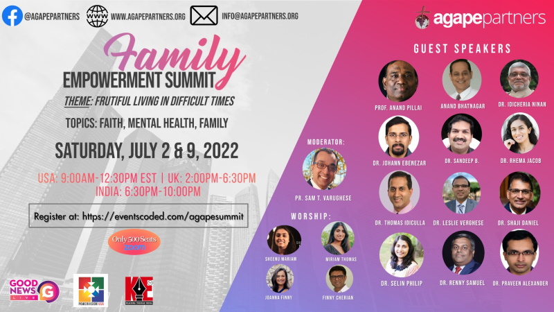 താറുമാറായ ഒരു ലോകത്ത് ഫലപ്രദമായ ജീവിതം എപ്രകാരം നയിക്കാം. കുടുംബ ശാക്തീകരണ വെബിനാറിലേക്കു സ്വാഗതം. വിശ്വാസം, കുടുംബം, മാനസികാരോഗ്യം, ശാക്തീകരണ വെബിനാറിലേക്കു ഏവർക്കും സ്വാഗതം. ഈ വെല്ലുവിളി നിറഞ്ഞ സമയങ്ങളിൽ വിശ്വാസം, കുടുംബം, മാനസികാരോഗ്യം മുതലായ വിഷയങ്ങളെ ആസ്പദമാക്കി കൗൺസിലിംഗ് രംഗത്ത് പഠനവും പരിശീലനവും അനുഭവമും ഉള്ള വ്യക്തികൾ സംസാരിക്കുന്നു. ക്രിസ്തീയ മാനസിക ആരോഗ്യ വിദഗ്ധർ, കൗൺസിലർമാർ, നേതാക്കൾ എന്നിവർ സംസാരിക്കുന്നു. ജൂലൈ രണ്ടിന് നടത്തപ്പെടുന്ന ഈ ഓൺലൈൻ സെമിനാറിൽ പ്രായോഗീക ജീവിതത്തിൽ തങ്ങളുടെ കുടുംബബന്ധത്തെ എങ്ങനെ ശക്തിപ്പെടുത്താം എന്ന് സവിസ്തരം ചർച്ച ചെയ്യുന്നു. കഴിഞ്ഞ വർഷങ്ങളിൽ 15 രാജ്യങ്ങളിൽ നിന്നുള്ള 500 പേർ ഉച്ചകോടിയിൽ പങ്കെടുത്തു. അഗാപെ പാർട്ണേഴ്സ് ഇന്റർനാഷണൽ സംഘടിപ്പിക്കുന്ന ‘ഓൺലൈൻ ഫാമിലി വെബിനാറിലേക്കു സ്വാഗതം. ജൂലൈ രണ്ടിന് നടത്തപ്പെടുന്ന ഈ ഓൺലൈൻ സെമിനാർ, ക്രിസ്തീയ വീക്ഷണകോണിൽ നിന്ന് നിങ്ങളുടെ കുടുംബത്തെ ശക്തിപ്പെടുത്തുന്നതിന് പ്രസക്തമായ…