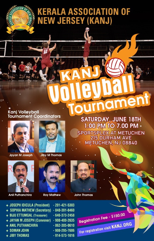 ന്യൂജേഴ്സി: മലയാളിയുടെ കായിക വിനോദങ്ങളെ പ്രോത്സാഹിപ്പിക്കുക എന്ന ലക്ഷ്യത്തോടെ അനേക വർഷങ്ങളായി കേരള അസോസിയേഷൻ ഓഫ് ന്യൂ ജേഴ്സി (KANJ) സംഘടിപ്പിച്ചു വരാറുള്ള കാൻജ് വോളിബോൾ ടൂർണമെന്റ് 2022 ജൂൺ 18 ന്, ലോകോത്തര നിലവാരത്തിലുള്ള വോളീബോൾ രംഗത്തേക്ക് മലയാളിയെ അതിലുപരി ഇന്ത്യയെ കൈപിടിച്ചുയർത്തിയ ജിമ്മി ജോർജ് എന്ന അതികായകന്റെ ഓർമകളിൽ മലയാളി എന്നും നെഞ്ചിലേറ്റുന്ന കായിക വിനോദമാണ് വോളീബോൾ, മലയാളത്തിൻറെ ഗന്ധമുള്ള കലാ കായികമാമാങ്കങ്ങൾ എന്നും മലയാളികൾക്കായി കാഴ്ച വയ്ക്കാറുള്ള കേരള അസോസിയേഷൻ ഓഫ് ന്യൂ ജേഴ്സി വിവിധ സംസ്ഥാനങ്ങളിൽ നിന്നുള്ള പ്രശസ്തരായ വോളീബോൾ ടീമുകളെ സംഘടിപ്പിച്ചു കൊണ്ട് വീണ്ടും കളം നിറയുകയാണ്, വോളീബോളിലെ അതികായകന്മാർ ഏറ്റു മുട്ടുന്ന ഈ ടൂർണ്ണമെന്റിലേക്ക് എല്ലാ മലയാളികളെയും കായികപ്രേമികളെയും സ്വാഗതം ചെയ്യുന്നതായി പ്രസിഡന്റ് ജോസഫ് ഇടിക്കുള അറിയിച്ചു, ജയൻ ജോസഫ്, ജിബി തോമസ്, അനിൽ പുത്തൻചിറ, സോമൻ ജോൺ,…