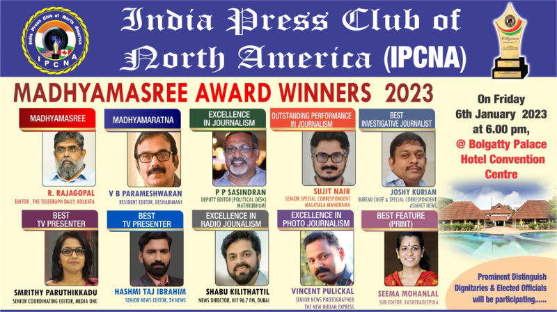 ഇന്ത്യ പ്രസ്ക്ലബ് ഓഫ് നോർത്ത് അമേരിക്ക മാധ്യമ പുരസ്കാരങ്ങൾ പ്രഖ്യാപിച്ചു