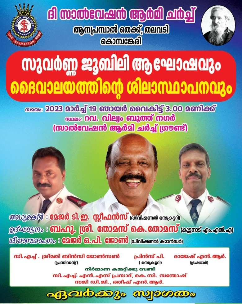 എടത്വ : ദി സാൽവേഷൻ ആർമി ചർച്ച് കൊമ്പങ്കേരി ഇടവകയുടെ സുവർണ്ണ ജൂബിലി ആഘോഷവും പുതുക്കി പണിയുന്ന ദൈവാലയത്തിൻ്റെ ശിലാസ്ഥാപനവും മാർച്ച് 19ന് നടക്കും. സി.എച്ച്:ബിൻസി ജോൺസൻ്റെ നേതൃത്വത്തിൽ രാവിലെ 10.30ന് സ്ത്രോത്ര ശുശ്രൂഷ നടക്കും. 3 മണിക്ക് വിശിഷ്ട അതിഥികൾക്ക് സ്വീകരണം നല്കും. തുടർന്ന് ആനപ്രമ്പാൽ തെക്ക് തലവടി റവ. വില്യം ബൂത്ത് നഗറിൽ (സാൽവേഷൻ ആർമി ചർച്ച് ഗ്രൗണ്ട് )ചേരുന്ന പൊതുസമ്മേളനം തോമസ് കെ. തോമസ് എം.എൽ.എ ഉദ്ഘാടനം ചെയ്യും.ഡിവിഷണൽ സെക്രട്ടറി മേജർ ടി.ഇ സ്റ്റീഫൻസ് അധ്യക്ഷത വഹിക്കും.ഐക്യരാഷ്ട്രസഭ,സുസ്ഥിര വികസന ലക്ഷ്യം അംബാസിഡർ ഡോ.ജോൺസൺ വാലയിൽ ഇടിക്കുളയിൽ നിന്നും ആദ്യ സംഭാവന ഡിവിഷണൽ കമാൻഡർ മേജർ ഒ.പി ജോൺ സ്വീകരിക്കും. ഡിവിഷണൽ കമാൻഡർ മേജർ ഒ.പി ജോൺ ശിലാസ്ഥാപനം നിർവഹിക്കും. നിരണം സെൻ്റ് തോമസ് മാർത്തോമ്മ ചർച്ച് വികാരി റവ. തോമസ് വർഗ്ഗീസ്,പാണ്ടങ്കേരി സെൻ്റ്…