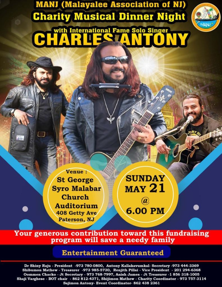 ന്യൂജേഴ്സി : ന്യൂ ജേഴ്സിയിലെ പ്രമുഖ മലയാളീ സംഘടനയായ മഞ്ചിന്റെ (MANJ) ചാരിറ്റി ഇവന്റിൽ സുപ്രസിദ്ധ ഗായകൻ ചാൾസ് ആന്റണിയുടെ മ്യൂസിക്കൽ നൈറ്റ് , ഡിന്നറോഡ് കുടി മെയ് 21 ഞായറാഴ്ച വൈകിട്ട് ആറു മണിമുതൽ സെന്റ് ജോർജ് സിറോ മലബാർ ചർച് ഓഡിറ്റോറിയത്തിൽ (408 Getty Ave , Patterson, NJ)വെച്ച് നടത്തുന്നതാണ് . ലോകപ്രശസ്തരായ വ്യക്തികളുടെ മുമ്പിൽ 18 ഭാഷകളിലായി വിവിധയിനം ഗാനങ്ങൾ ആലപിച്ച് തന്റെതായ മികവ് തെളിയിച്ച വ്യക്തിയാണ് പ്രസിദ്ധ ഗായകൻ ചാൾസ് ആന്റണി. ഗാനത്തോടൊപ്പം വിവിധ സംഗീതപകരണങ്ങളും അദ്ദേഹം കൈകാര്യം ചെയ്യാറുണ്ട്. ഏത് പ്രായക്കാർക്കും ഒരുപോലെ ആസ്വദിക്കാൻ കഴിയുന്നതാണ് അദ്ദേഹത്തിന്റെ ഗാനങ്ങൾ. മറ്റുള്ളവരുടെ പ്രയാസങ്ങളിലും, ദുരന്തങ്ങളിലും അവരെ സഹായിക്കുവാന് കഴിഞ്ഞാൽ അതിൽ പരം ദൈവികമായാ ഒരു പ്രവർത്തി വേറെ ഇല്ല. ജീവകാരുണ്യ പ്രവർത്തനങ്ങൾ സമൂഹ നന്മയുടെ ഭാഗമാണ് എന്ന് വിശ്വസിക്കുന്നവരാണ് നമ്മൾ…