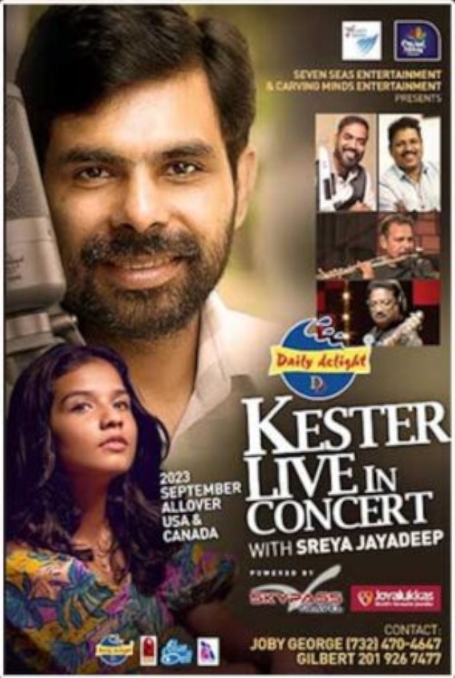 മലയാള ക്രൈസ്തവ സംഗീതത്തിലെ ‘ഡിവൈൻ വോയിസ് ‘ എന്നറിയപെടുന്ന ഗായകൻ കെസ്റ്റെർ അമേരിക്കൻ മലയാളികളുടെ മുന്പിലേക്കു എത്തുന്നു. ഡെയിലി ഡിലൈറ് കെസ്റ്റർ ലൈവ് എന്ന നാമകരണം ചെയ്ത് മെഗാ ഷോ 2023 സെപ്റ്റംബർ എത്തുന്നത്. പ്രമുഖ ഇവന്റ് സംഘാടക ഗ്രൂപ്പായ കാര്വിംഗ് മൈന്ഡ്സ് എന്റര്ടെയ്ന്മെന്റ് ന്യൂജേഴ്സി സംഘടിപ്പിക്കുന്ന ഷോയിലേക്കാണ് കെസ്റ്ററിന്റെ എത്തുന്നത് .കെസ്റ്ററിനെ കൂടാതെ മലയാള ക്രൈസ്തവ ഗാന രംഗത്തെ വേറിട്ട ശബ്ദത്തിന്റെ ഉടമയായ ശ്രേയ ജയദീപും ഇ സംഗീത പരിപാടിയുടെ കൂടെ എത്തുന്നു . ഇന്ന് കേരളത്തിലെങ്ങും മികച്ച ഡിവൊഷനൽ ഗായകനെന്ന് പേരെടുത്ത കെസ്റ്റര് വിവിധ സംവിധായകര്ക്ക് കീഴില് ആയിരക്കണക്കിന് ഭക്തിഗാനങ്ങള് പാടിക്കഴിഞ്ഞു. മലയാളി ക്രിസ്ത്യന് സമൂഹങ്ങളില്; ഇന്ന് കെസ്റ്ററിന്റെ സ്വരമാധുരിക്ക് ആരാധകരേറെ. നിന്സ്നേഹം എത്രയോ അവര്ണനീയം ,ഇന്നയോളം എന്നെ നടത്തി… ,നന്മ മാത്രമേ.. ,അമ്മെ അമ്മെ തായേ …,നിന്റെ തകര്ച്ചയില് ആശ്വാസമേകാന്… ,നിത്യ സ്നേഹത്താല്…