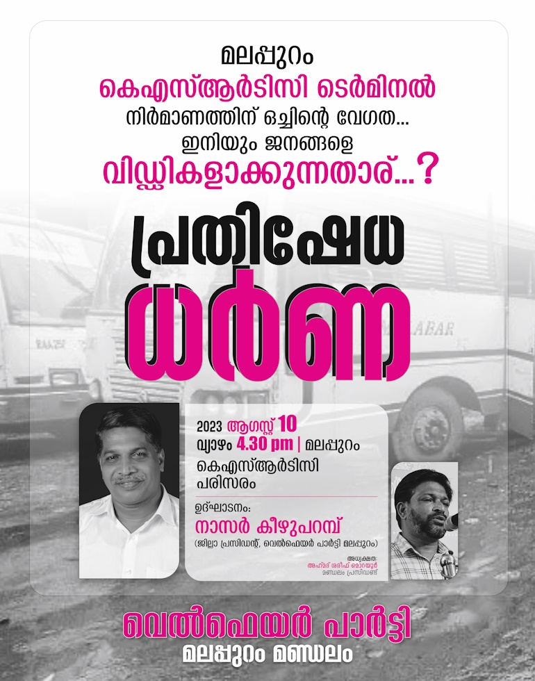 മലപ്പുറം: കെ.എസ്.ആർ.ടി.സി ബസ് ടെർമിനൽ നിർമാണം അനന്തമായി നീളുന്നതിൽ പ്രതിഷേധിച്ച് വെൽഫെയർ പാർട്ടി മലപ്പുറം മണ്ഡലം കമ്മിറ്റി സംഘടിപ്പിക്കുന്ന ധർണ ഇന്ന് വൈകീട്ട് 4.30ന് മലപ്പുറം കെ.എസ്.ആർ.ടി.സി പരിസരത്ത് നടക്കും. 2014ൽ പ്രഖ്യാപിക്കപ്പെട്ട പദ്ധതി വർഷങ്ങൾ കഴിഞ്ഞിട്ടും ഇഴഞ്ഞുനീങ്ങുകയാണ്. ഇടത് സർക്കാറും മണ്ഡലം എം.എൽ.എയും നിരന്തരം വാഗ്ദാനങ്ങൾ നൽകുക മാത്രമാണ് ചെയ്തുകൊണ്ടിരിക്കുന്നതെന്നും ജനങ്ങളെ വിഡ്ഡികളാക്കാനാണ് അധികൃതർ ശ്രമിക്കുന്നതെന്ന് മണ്ഡലം കമ്മിറ്റി ആരോപിച്ചു. ധർണ വെൽഫെയർ പാർട്ടി ജില്ല പ്രസിഡന്റ് നാസർ കീഴുപറമ്പ് ഉദ്ഘാടനം ചെയ്യും. മണ്ഡലം പ്രസിഡൻറ് അഹ്മദ് ശരീഫ് മൊറയൂർ, കെ.എൻ ജലീൽ, ഫ്രറ്റേണിറ്റി ജില്ലാ പ്രസിഡണ്ട് ജംഷീൽ അബൂബക്കർ, മണ്ഡലം പ്രസിഡന്റ് തസ്നീം മുബീൻ, വിമൺ ജസ്റ്റിസ് മൂവ്മെന്റ് മണ്ഡലം കൺവീനർ മാജിദ എം, സമര കൺവീനർ ടി അഫ്സൽ തുടങ്ങിയവർ സംസാരിക്കും.