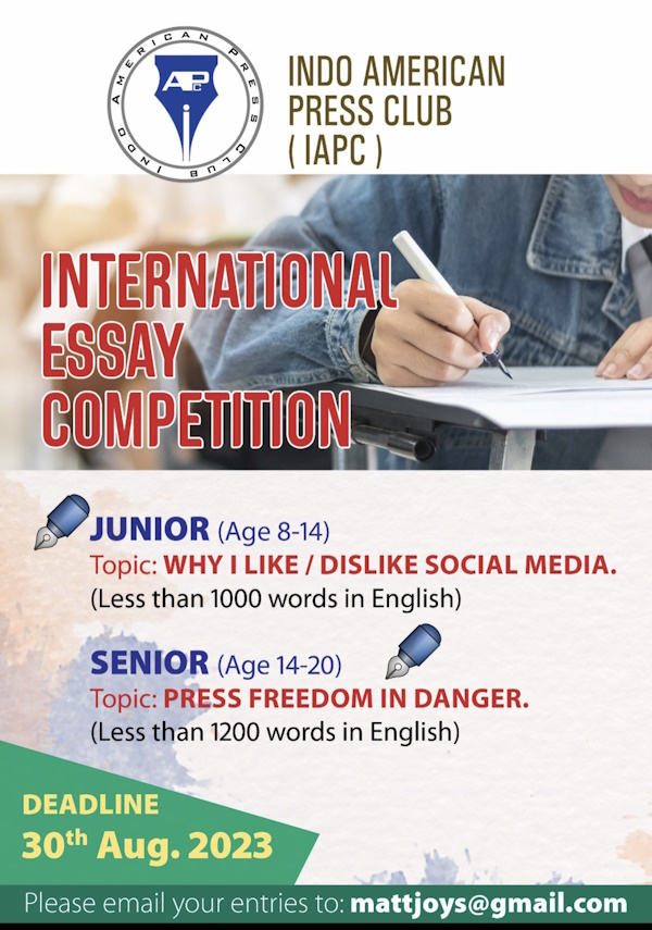 The Indo-American Press Club invites entries to the Essay Competition organized in conjunction with the 9th International Media Conference of the IAPC. IAPC was formed to unite the media groups and the Indian diaspora media fraternity across North America under one umbrella to work together, support one another, and provide a unified voice to the mainstream media world and the larger community. The competition is conducted in two categories namely Junior (Ages 8 – 14) and Senior (15 – 20). The topic for Junior Category: ( Why I like /…