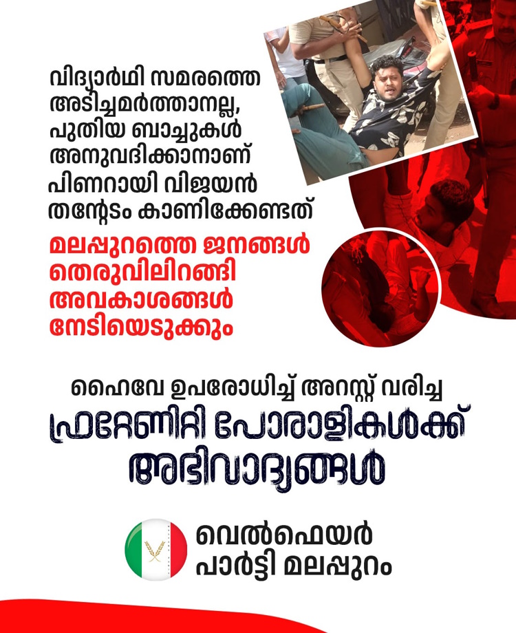 മലപ്പുറം : പ്ലസ് വൺ മൂന്നാം അലോട്മെൻ്റ് പൂർത്തിയായപ്പോൾ മലപ്പുറം ജില്ലയിൽ കാൽ ലക്ഷത്തിലധികം വിദ്യാർഥികൾ പ്രവേശനം ലഭിക്കാതെ പുറത്ത് നിൽക്കുകയാണ്. നിലവിലെ പ്രതിസന്ധി പരിഹരിക്കാൻ പുതിയ ബാച്ചുകൾ അനുവദിച്ചേ പറ്റൂ എന്നാവശ്യപ്പെട്ട് തെരുവിൽ സമരം ചെയ്യുന്ന ഫ്രറ്റേണിറ്റി മൂവ്മെൻ്റ് അടക്കമുള്ള സമര സംഘടനകളെ പോലീസിനെ ഉപയോഗിച്ച് മർദ്ദിച്ചും കേസ് ചുമത്തിയും മുന്നോട്ടു പോകുന്ന സർക്കാറിനെതിരെ ശക്തമായ ജനരോഷം ഉയർത്തിക്കൊണ്ടുവരും. ഇടതുപക്ഷ വിദ്യാർഥി സംഘടനയായ എസ്.എഫ് ഐ നേതൃത്വത്തിനടക്കം ജില്ലയിലെ ഈ പ്ലസ് വൺ സീറ്റുപ്രതിസന്ധി അംഗീകരിക്കേണ്ടി വന്നിരിക്കുന്നു. ഈ സന്ദർഭത്തിലും ഫീസ് കൊടുത്ത് പഠിക്കേണ്ട അൺഎയ്ഡഡ് സീറ്റുകൾ ഉൾപ്പെടുത്തി പ്രതിസന്ധിയിലെന്ന് വരുത്തി തീർക്കാനുള്ള വിദ്യാഭ്യാസ മന്ത്രിയുടെ ശ്രമം അസഹനീയവും മലപ്പുറത്തെ ജനങ്ങളെയൊന്നടങ്കം വിണ്ഡിയാക്കുന്നതുമാണ്. വിദ്യാർഥി സമരത്തെ അടിച്ചമർത്താനല്ല, പുതിയ ബാച്ചുകൾ അനുവദിക്കാനാണ് പിണറായി വിജയൻ തൻ്റേടം കാണിക്കേണ്ടത് എന്നും മലപ്പുറത്തെ ജനങ്ങൾ തെരുവിലിറങ്ങി അവകാശങ്ങൾ നേടിയെടുക്കും…