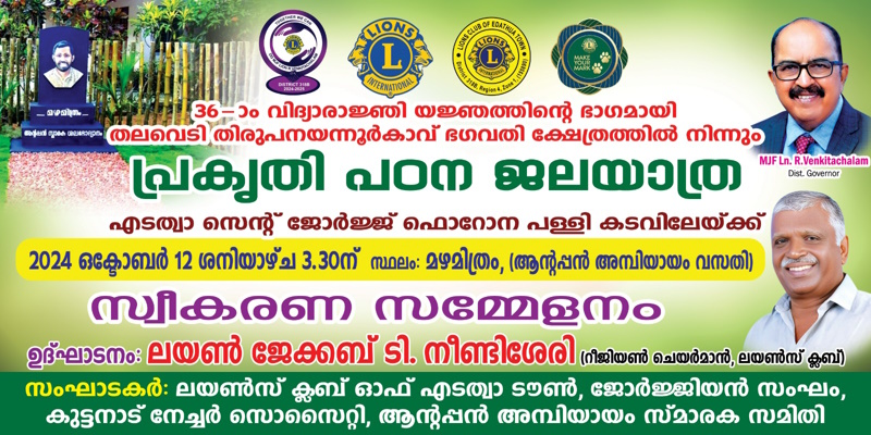 എടത്വ : തലവെടി തിരുപനയനൂർകാവ് ഭഗവതി ക്ഷേത്രത്തിലെ നവരാത്രി മഹോത്സവത്തോടനുബന്ധിച്ച് 36-ാം വിദ്യാരാഞ്ഞ്ജി യജ്ഞത്തിന്റെ ഭാഗമായി മഴമിത്രത്തിലേക്ക് നടത്തുന്ന പ്രകൃതി പഠന ജലയാത്രയ്ക്ക് ഒക്ടോബർ 12 ശനിയാഴ്ച 3.30ന് എടത്വ സെന്റ് ജോർജ്ജ് ഫെറോന പള്ളി കടവിൽ സ്വീകരണം നല്കും. തിരുപനയനൂർകാവ് ഭഗവതി ക്ഷേത്ര കടവിൽ നിന്നും തലവടി ഗ്രാമപഞ്ചായത്ത് പ്രസിഡന്റ് ഗായത്രി ബി നായർ ഫ്ളാഗ് ഓഫ് ചെയ്യും.മുഖ്യ കാര്യദർശി ബ്രഹ്മമശ്രീ നീലകണ്ഠരെര് ആനന്ദ് പട്ടമന അധ്യക്ഷത വഹിക്കും. എടത്വ പള്ളി കടവിൽ എത്തി ചേരുന്ന 50 അംഗ സംഘത്തെ എടത്വ ടൗൺ ലയൺസ് ക്ലബ്ബിന്റെയും കുട്ടനാട് നേച്ചർ സൊസൈറ്റിയുടെയും ജോർജിയൻ സംഘത്തിന്റെയും, ആന്റപ്പൻ അമ്പിയായം സ്മാരക സമിതിയുടെയും നേതൃത്വത്തില് എടത്വ ഗ്രാമ പഞ്ചായത്ത് പ്രസിഡന്റ് ലിജി വർഗ്ഗീസ്, വൈസ് പ്രസിഡന്റ് രേശ്മ ജോൺസൺ എന്നിവർ ചേർന്ന് സ്വീകരിക്കും.ലയൺസ് ക്ലബ് റീജിയണൽ ചെയർമാൻ ജേക്കബ് ടി…