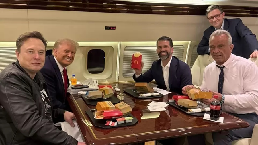 എലോൺ മസ്ക്, ഡൊണാൾഡ് ട്രംപ്, മൈക്ക് ജോൺസൺ എന്നിവരടങ്ങുന്ന ഒരു ഗ്രൂപ്പ് ഫോട്ടോ ഡൊണാൾഡ് ട്രംപ് ജൂനിയർ സോഷ്യൽ മീഡിയയിൽ പങ്കിട്ടു. ഈ ഫോട്ടോയിൽ, റോബര്ട്ട് എഫ് കെന്നഡി ജൂനിയർ കൈയിൽ ഒരു ബർഗർ പിടിച്ചിരിക്കുന്നതായി കാണുന്നു, മറുവശത്ത് ഒരു കൊക്കകോള കുപ്പിയും…!! ന്യൂയോര്ക്ക്: ആരോഗ്യ-മനുഷ്യ സേവന വകുപ്പിൻ്റെ (എച്ച്എച്ച്എസ്) തലവനായി യുഎസ് പ്രസിഡൻ്റ് ഡൊണാൾഡ് ട്രംപ് അടുത്തിടെ നിയമിച്ച റോബർട്ട് എഫ് കെന്നഡി ജൂനിയർ സോഷ്യൽ മീഡിയയിൽ പോസ്റ്റ് ചെയ്ത ഒരു ചിത്രമാണ് ഇപ്പോള് വാർത്തകളിൽ ഇടംപിടിക്കുന്നത്. ഈ ചിത്രത്തിൽ, ട്രംപിൻ്റെ സ്വകാര്യ വിമാനമായ “ട്രംപ് ഫോഴ്സ് വണ്ണിൽ” എലോൺ മസ്ക്, ഡൊണാൾഡ് ട്രംപ്, മൈക്ക് ജോൺസൺ, ഡൊണാള്ഡ് ട്രംപ് ജൂനിയര് എന്നിവര് മക്ഡൊണാൾഡിൻ്റെ ബിഗ് മാക്കിനും കൊക്കകോളയ്ക്കുമൊപ്പം കെന്നഡി പോസ് ചെയ്യുന്നതു കാണാം. യുഎഫ്സി 309 ഇവൻ്റിനായി ന്യൂയോർക്കിലെ മാഡിസൺ സ്ക്വയർ ഗാർഡനിലേക്കുള്ള യാത്രയ്ക്കിടെ…