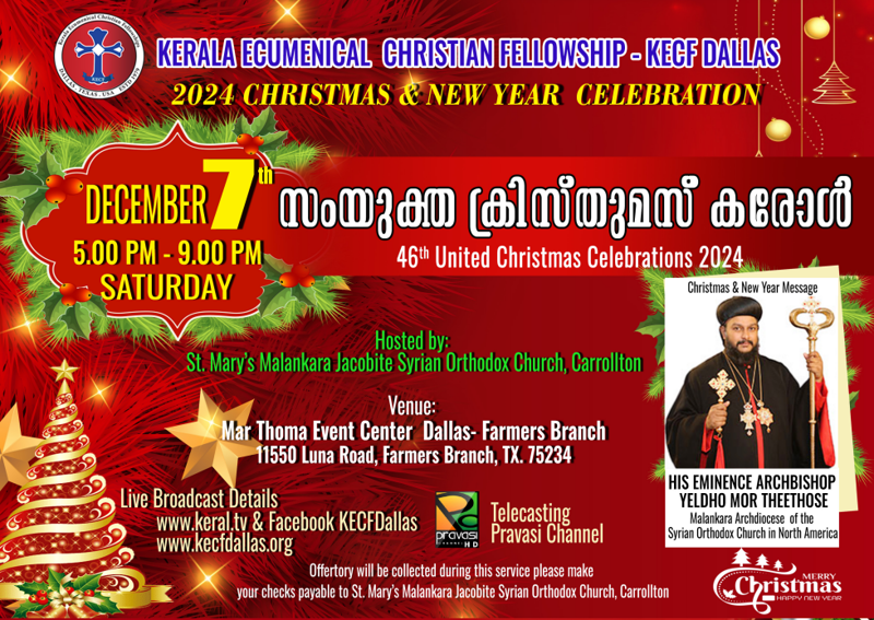 ഡാളസ്: കേരള എക്ക്യൂമെനിക്കൽ ക്രിസ്ത്യൻ ഫെല്ലോഷിപ്പിന്റെ നേതൃത്വത്തിൽ ഡാളസിൽ നടത്തപ്പെടുന്ന 46 – മത് എക്ക്യൂമെനിക്കൽ ക്രിസ്തുമസ് – പുതുവത്സരാഘോഷങ്ങൾ ഡിസംബർ 7 ശനിയാഴ്ച്ച വൈകിട്ട് 5 മണിക്ക് ഡാളസിലെ മാർത്തോമ്മ ഇവന്റ് സെന്ററിൽ ( 11550 Luna Road, Farmers Branch, Tx 75234) വെച്ച് നടത്തപ്പെടും. മലങ്കര യാക്കോബായ സുറിയാനി സഭയുടെ നോർത്ത് അമേരിക്ക ഭദ്രാസന ആർച്ച് ബിഷപ്പ് എൽദോ മാർ തിത്തോസ് ക്രിസ്തുമസ് – ന്യുഇയർ സന്ദേശം നൽകും. ഡാളസിലെ വിവിധ സഭകളിൽപ്പെട്ട അനേക ഇടവകളിലെ ഗായകസംഘങ്ങളുടെ ഗാനശുശ്രുഷ ഉണ്ടായിരിക്കും. ഈ വർഷത്തെ ആഘോഷങ്ങൾക്ക് നേതൃത്വം വഹിക്കുന്നത് ഡാളസിലെ കരോൾട്ടണിലുള്ള സെന്റ.മേരിസ് മലങ്കര യാക്കോബായ സിറിയൻ ഓർത്തഡോക്സ് ഇടവകയാണ്. വിവിധ സഭാ വിഭാഗത്തിൽപ്പെട്ട ഇരുപത്തി ഒന്ന് ഇടവകളിലെ വൈദീകരും, വിശ്വാസികളും ഒന്നിച്ചു ചേരുന്ന ഒരു മഹാസംഗമം ആണ് കഴിഞ്ഞ 45 വർഷമായി ഡാളസിൽ…