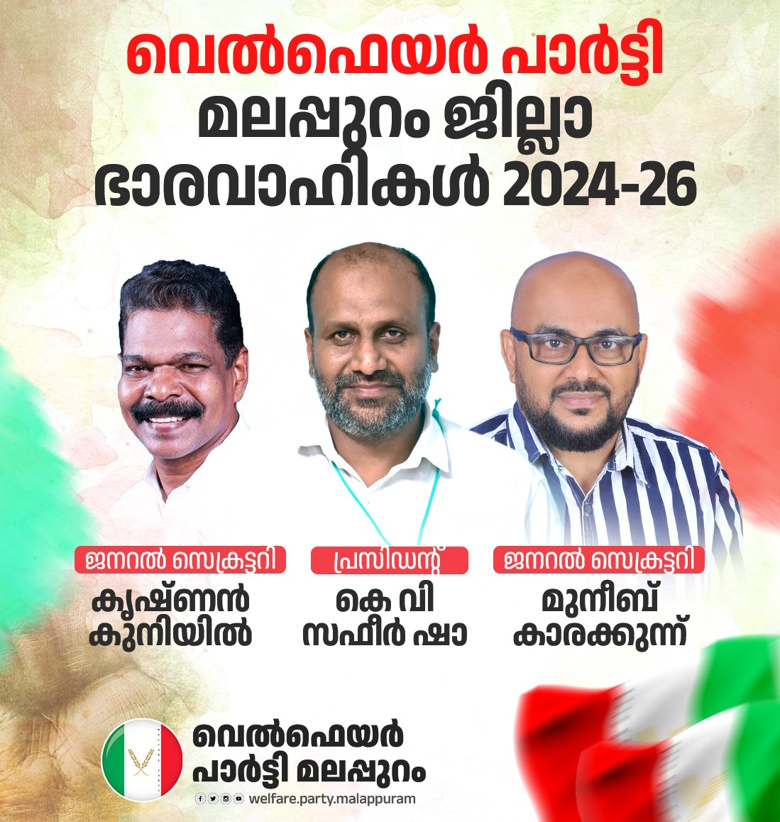 മലപ്പുറം: വെൽഫെയർ പാർട്ടി മലപ്പുറം ജില്ലാ കമ്മിറ്റിയുടെ പുതിയ ഭാരവാഹികളെ കോട്ടക്കൽ പറങ്കിമൂച്ചിക്കൽ ഉസ്മാൻ പാണ്ടിക്കാട് നഗറിൽ വെച്ച് നടന്ന ജില്ലാ സമ്മേളനത്തിൽ തിരഞ്ഞെടുത്തു. ജില്ലാ പ്രസിഡണ്ടായി കെ.വി. സഫീർ ഷാ, ജില്ലാ ജനറൽ സെക്രട്ടറിമാരായി മുനീബ് കാരക്കുന്ന്, കൃഷ്ണൻ കുനിയിൽ എന്നിവരെ തെരഞ്ഞെടുത്തു. 38 അംഗ ജില്ല കമ്മിറ്റി അംഗങ്ങളെയും സമ്മേളനത്തിൽ വച്ച് തെരഞ്ഞെടുത്തു. സംസ്ഥാന ട്രഷറർ സജീദ് ഖാലിദ്, സംസ്ഥാന സെക്രട്ടറി പ്രേമ ജി പിഷാരടി, സംസ്ഥാന സമിതി അംഗം ബിനു വയനാട് എന്നിവരുടെ നേതൃത്വത്തിലാണ് തെരഞ്ഞെടുപ്പ് നടത്തിയത്. സമ്മേളനത്തിൽ ജില്ല വികസനത്തിനുള്ള ആവശ്യങ്ങളും മലപ്പുറം ജില്ല വിഭജിക്കാനുള്ള പ്രമേയവും അവതരിപ്പിക്കുകയും സാമൂഹിക-രാഷ്ട്രീയ വീക്ഷണങ്ങൾ ചർച്ച ചെയ്യുകയും ചെയ്തു. സമ്മേളനത്തിൽ പ്രവർത്തന റിപ്പോർട്ടിന്റെ അവതരണവും വിശദമായ ചർച്ചയും നടന്നു.