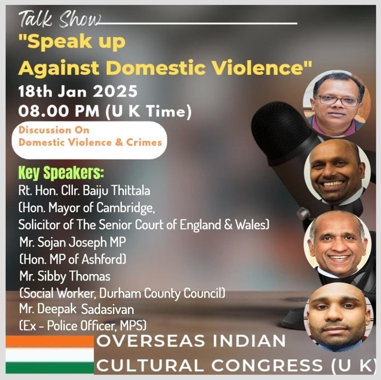 ഗാർഹിക പീഡനങ്ങൾക്കെതിരെ നിയമവശങ്ങളുടെ വിശദീകരണം; ഓ ഐ സി സി (യു കെ) ഓൺലൈൻ ചർച്ചാ ക്ലാസ്സ് ജനുവരി 18 (ശനിയാഴ്ച) രാത്രി 8 മണിക്ക്