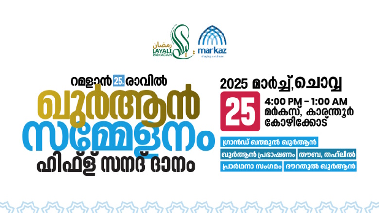 വൈകുന്നേരം 4 മുതൽ നാളെ പുലർച്ചെ 1 വരെ ഖുർആൻ പ്രമേയമായ വിവിധ ആത്മീയ പരിപാടികൾ ഖുർആൻ പഠന രംഗത്ത് മികവ് പുലർത്തിയ പ്രതിഭകളെ ആദരിക്കും കോഴിക്കോട്: മർകസ് അക്കാദമി ഓഫ് ഖുർആൻ സ്റ്റഡീസിന്റെ 9 ക്യാമ്പസുകളിൽ നിന്ന് ഖുർആൻ ഹൃദിസ്ഥമാക്കിയ 79 ഹാഫിളുകൾ ഇന്ന്(ചൊവ്വ) നടക്കുന്ന ഖുർആൻ സമ്മേളനത്തിൽ സനദ് സ്വീകരിക്കും. വിശുദ്ധ ഖുർആൻ അവതീർണമായ മാസത്തിൽ ഖുർആൻ പ്രമേയമായി നടത്തപ്പെടുന്ന കേരളത്തിലെ ഏറ്റവും വലിയ സമ്മേളനത്തിന് സമസ്ത കേരള ജംഇയ്യത്തുൽ ഉലമ സാരഥികളും സാദാത്തുക്കളും പണ്ഡിതരും നേതൃത്വം നൽകും. ലൈലതുൽ ഖദ്ർ പ്രതീക്ഷിക്കപ്പെടുന്ന 25-ാം രാവിൽ വൈകുന്നേരം 4 മുതൽ നാളെ(ബുധൻ) പുലർച്ചെ 1 വരെ നടക്കുന്ന സമ്മേളനത്തിൽ വിവിധ ആത്മീയ-പ്രാർഥനാ മജ്ലിസുകളാണ് നടക്കുക. സുൽത്വാനുൽ ഉലമ കാന്തപുരം ഉസ്താദിന്റെ പ്രഭാഷണവും ആയിരം ഹാഫിളുകൾ നേതൃത്വം നൽകുന്ന ഗ്രാൻഡ് ഖത്മുൾ ഖുർആൻ സദസ്സും സമ്മേളനത്തിന്റെ…