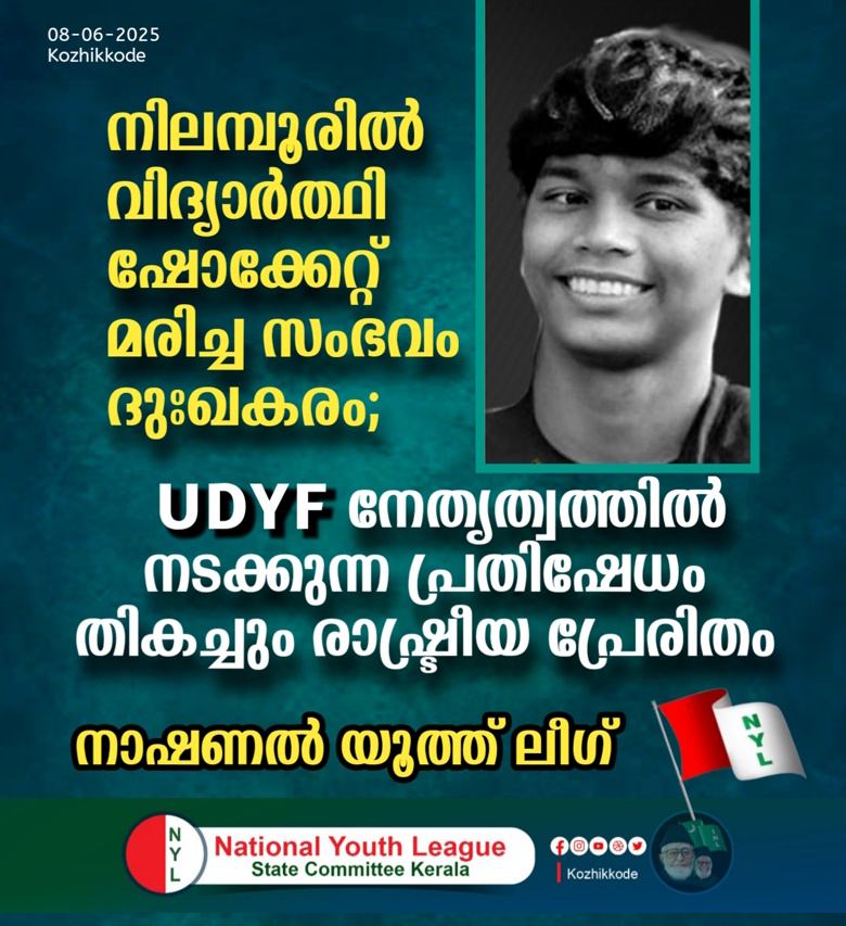 നിലമ്പൂരിൽ വിദ്യാർത്ഥി ഷോക്കേറ്റ് മരിച്ച സംഭവം ദുഃഖകരം; UDYF നേതൃത്വത്തിൽ നടക്കുന്ന പ്രതിഷേധം തികച്ചും രാഷ്ട്രീയ പ്രേരിതം: നാഷണൽ യൂത്ത് ലീഗ്