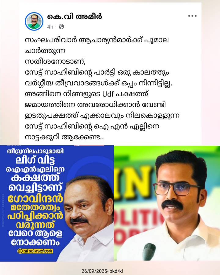 ഐ എൻ എല്ലി നെതിരെ പ്രതിപക്ഷ നേതാവ് നടത്തിയ തീവ്രവാദ ആരോപണങ്ങൾക്കെതിരെ നാഷണൽ യൂത്ത് ലീഗ് നേതാവ് രംഗത്ത്. പാലക്കാട്: മുസ്ലിം ലീഗിന് തീവ്രത പോരാത്തതിന് ലീഗ് വിട്ടവർ ആണ് ഐ എൻ എൽ എന്നും അവരെ കക്ഷത്ത് വെച്ചാണ് ഗോവിന്ദൻ മാഷ് കോണ്ഗ്രസ് നെ മതേതരത്വം പഠിപ്പിക്കാൻ വരുന്നതെന്നും പ്രതിപക്ഷ നേതാവ് വി.ഡി സതീശൻ ഇന്ന് മാധ്യമങ്ങൾക്ക് മുന്നിൽ പറഞ്ഞിരുന്നു. എന്നാൽ, തീവ്രവാദ ചാപ്പ ഇങ്ങോട്ട് വേണ്ടന്നും, വി.ഡി സതീശൻ സംഘപരിവാർ ആചാര്യൻമാർക്ക് പൂമാല ചാർത്തിയ നേതാവാണെന്നു, മുസ്ലിം ലീഗിന്റെ ഉപദേശത്തോടെ ജമാഅത്തെ ഇസ്ലാമിയെ യുഡിഎഫ് ൽ അവരോധിക്കുന്നതിന് വേണ്ടി സേട്ട് സാഹിബിന്റെ പാർട്ടിയെയും ഇടതുപക്ഷത്തെയും ആക്രമിച്ചാൽ തിരിച്ചടി നേരിടേണ്ടി വരുമെന്ന് നാഷണൽ യൂത്ത് ലീഗ് സംസ്ഥാന ട്രഷറർ കെ.വി.അമീർ തന്റെ ഫേസ്ബുക്ക്ൽ കുറിച്ചു. വിഷയത്തിൽ ഐ എൻ എൽ സംസ്ഥാന പ്രസിഡന്റ് അഹമ്മദ് ദേവർകോവിലും…