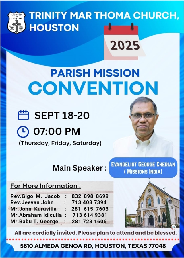 ഹൂസ്റ്റൺ: ഹൂസ്റ്റൺ ട്രിനിറ്റി മാർത്തോമാ ഇടവകയിലെ ഇടവക മിഷന്റെ ആഭിമുഖ്യത്തിൽ ഈ വർഷത്തെ കൺവെൻഷൻ സെപ്തംബർ 18,19,20 (വ്യാഴം, വെള്ളി, ശനി) തീയതികളിൽ നടത്തപ്പെടും. ട്രിനിറ്റി ദേവാലയത്തിൽ (5810, Almeda Genoa Rd, Houston , TX 77048) വച്ച് നടത്തപെടുന്ന കൺവെൻഷൻ യോഗങ്ങൾ ഇടവക ഗായക സംഘത്തിന്റെ ഗാനശുഷ്രയോടു കൂടി വൈകുന്നേരം 7 മണിക്ക് ആരംഭിക്കും. പ്രമുഖ ദൈവശാസ്ത്ര ചിന്തകനും, കൺവെൻഷൻ പ്രസംഗകനും, മിഷൻസ് ഇന്ത്യ സ്ഥാപകനും ചെയർമാനുമായ ഡോ. ജോർജ് ചെറിയാൻ (തിരുവല്ല) ദൈവവചന പ്രഘോഷണത്തിനു നേതൃത്വം നൽകും. കൺവെൻഷൻ യോഗങ്ങളിൽ സംബന്ധിച്ച് അനുഗ്രഹം പ്രാപിക്കുവാൻ ഏവരെയും സന്തോഷപൂർവം ക്ഷണിക്കുന്നതായി ഇടവക മിഷൻ ഭാരവാഹികൾ അറിയിച്ചു. കൂടുതൽ വിവരങ്ങൾക്ക്: റവ. ജിജു എം ജേക്കബ് (വികാരി) – 832 898 8699 റവ. ജീവൻ ജോൺ (അസി. വികാരി) – 713 408 7394…