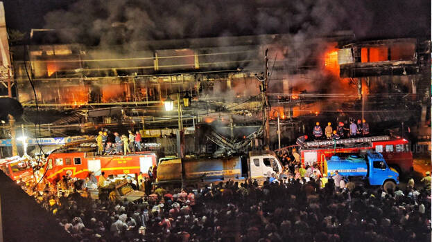 തളിപ്പറമ്പ് കെവി കോംപ്ലക്സിൽ വന് അഗ്നിബാധ; അമ്പതോളം കടകള് പൂര്ണ്ണമായും കത്തി നശിച്ചു