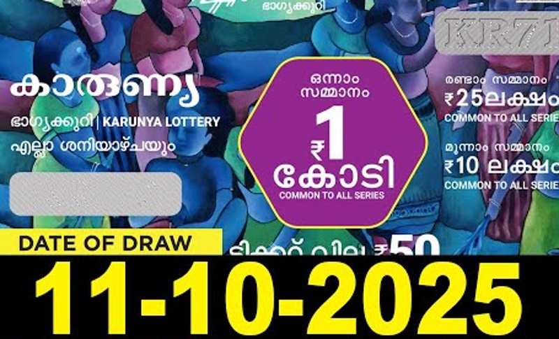 തിരുവനന്തപുരം: കേരള സംസ്ഥാന ഭാഗ്യക്കുറി വകുപ്പ് നടത്തിയ കാരുണ്യ KR-726 ലോട്ടറിയുടെ നറുക്കെടുപ്പ് ഇന്ന് (ഒക്ടോബർ 11, 2025) പ്രഖ്യാപിച്ചു. തിരുവനന്തപുരത്തെ ബേക്കറി ജംഗ്ഷനു സമീപമുള്ള ഗോർക്കി ഭവനിൽ ഉച്ചകഴിഞ്ഞ് 3:00 മണിക്ക് ആയിരുന്നു ഔദ്യോഗിക നറുക്കെടുപ്പ്. ഇരിങ്ങാലക്കുടയിൽ നിന്നുള്ള ഭാഗ്യശാലിയായ ടിക്കറ്റ് ഉടമയ്ക്ക് ഒന്നാം സമ്മാനമായ ഒരു കോടി രൂപ ലഭിച്ചു . ചിറ്റൂരിൽ വിറ്റ KL 874065 എന്ന ടിക്കറ്റ് നമ്പറിന് 25 ലക്ഷം രൂപയുടെ രണ്ടാം സമ്മാനവും , കോട്ടയത്ത് നിന്നുള്ള KK 397232 എന്ന ടിക്കറ്റ് നമ്പറിന് 10 ലക്ഷം രൂപയുടെ മൂന്നാം സമ്മാനവും ലഭിച്ചു . ഔദ്യോഗിക കാരുണ്യ KR-726 വിജയിച്ച നമ്പറുകൾ ഒന്നാം സമ്മാനം: 1 കോടി രൂപ (കെബി 705767) രണ്ടാം സമ്മാനം: 25 ലക്ഷം രൂപ (കെഎൽ 874065) മൂന്നാം സമ്മാനം: 10 ലക്ഷം രൂപ…