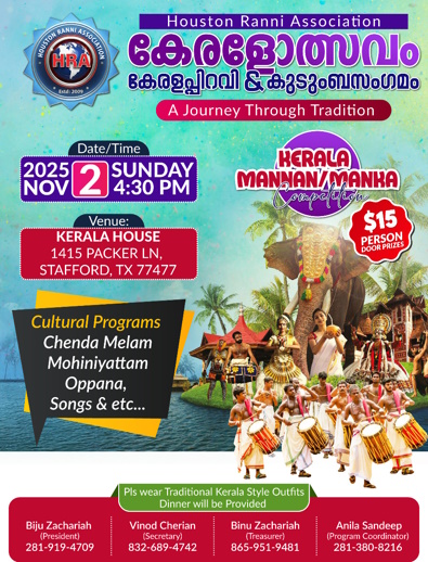 ഹൂസ്റ്റൺ: അമേരിക്കയിലെ പ്രമുഖ മലയാളി കൂട്ടായ്മകളിലൊന്നായ ഹൂസ്റ്റൺ റാന്നി അസോസിയേഷൻ (HRA) കേരളപ്പിറവി ആഘോഷവും കുടുംബസംഗമവും ‘കേരളോത്സവം – A Journey Through Tradition എന്ന പേരിൽ വൈവിധ്യമാർന്ന പരിപാടികളോടെ സംഘടിപ്പിക്കുന്നു. ഹൂസ്റ്റണിൽ നടക്കുന്ന ആദ്യത്തെ കേരളപ്പിറവി ആഘോഷങ്ങൾക്ക് വൻ പിന്തുണയാണ് ലഭിക്കുന്നത്. നവംബർ 2ന് ഞായറാഴ്ച, വൈകുന്നേരം 4:30-ന് സ്റ്റാഫോർഡിലെ കേരളാ ഹൗസിൽ (1415 Packer Ln, Stafford, TX 77477) വെച്ച് നടക്കുന്ന പരിപാടിയുടെ ഒരുക്കങ്ങൾ പൂർത്തിയായതായി ഭാരവാഹികൾ അറിയിച്ചു. മലയാളി പാരമ്പര്യം വിളിച്ചോതുന്ന ഈ ആഘോഷത്തിൽ വൈവിധ്യമാർന്ന കലാ- സാംസ്കാരിക പരിപാടികൾ അരങ്ങേറും. കൂടാതെ, പരിപാടിയിൽ പങ്കെടുക്കുന്നവർക്കായി വാഴയിലയിൽ രുചികരമായ കേരളതനിമയിൽ വിഭവസമൃദ്ധമായ വിരുന്നും ഒരുക്കിയിട്ടുണ്ട്. ഈ പരിപാടി വർണോജ്വലമാക്കാനുള്ള ഒരുക്കത്തിലാണ് സംഘാടകർ. മധുരമനോഹര ഗാനങ്ങൾ, മോഹിനിയാട്ടം, ഒപ്പന, വിവിധതരം നൃത്തങ്ങൾ,ചെണ്ടമേളം തുടങ്ങിയവ കേരളോത്സവത്തെ വേറിട്ടതും മികവുറ്റതുമാക്കി മാറ്റും. ഏറ്റവും നന്നായി കേരളത്തനിമയിൽ…