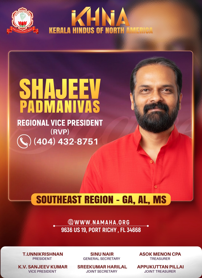 അറ്റ്ലാൻ്റ (ജോർജിയ): കേരള ഹിന്ദൂസ് ഓഫ് നോർത്ത് അമേരിക്ക (കെ.എച്ച്.എൻ.എ) യുടെ സൗത്ത് ഈസ്റ്റ് റീജിയണൽ വൈസ് പ്രസിഡന്റായി (RVP) പ്രമുഖ സാമൂഹ്യപ്രവർത്തകനായ ഷജീവ് പത്മനിവാസ് ചുമതലയേറ്റു. ജോർജിയ, അലബാമ, മിസിസിപ്പി (GA, AL, MS) സംസ്ഥാനങ്ങൾ ഉൾപ്പെടുന്ന മേഖലയെയാണ് അദ്ദേഹം പ്രതിനിധീകരിക്കുന്നത്. എറണാകുളം സ്വദേശിയായ ഷജീവ് നിലവിൽ അറ്റ്ലാൻ്റയിലാണ് താമസിക്കുന്നത്. പ്രവാസി മലയാളി സമൂഹത്തിൻ്റെ ഉന്നമനത്തിനായി വിവിധ തലങ്ങളിൽ പ്രവർത്തിച്ച് അദ്ദേഹം ശ്രദ്ധേയനായിട്ടുണ്ട്. കേരള ഹിന്ദൂസ് ഓഫ് ജോർജിയ (KHGA) യുടെ സ്ഥാപകാംഗവും നിലവിലെ ബോർഡ് ഓഫ് ട്രസ്റ്റി മെമ്പറുമാണ് ഷാജീവ്. ഗ്രേറ്റർ അറ്റ്ലാൻ്റ മലയാളി അസോസിയേഷൻ്റെ (ഗാമ) മുൻ പ്രസിഡൻ്റായും (2022) നിലവിൽ ബോർഡ് ഓഫ് ട്രസ്റ്റിയായും അദ്ദേഹം പ്രവർത്തിക്കുന്നു. കെ.എച്ച്.എൻ.എയുടെ 2023-25 കാലയളവിലും സൗത്ത് ഈസ്റ്റ് റീജിയൺ വൈസ് പ്രസിഡൻ്റ് പദവി അദ്ദേഹം വഹിച്ചിരുന്നു. കേരളത്തിൻ്റെ സംസ്കാരവും ആത്മീയ പാരമ്പര്യങ്ങളും സംരക്ഷിക്കുന്നതിലും സമൂഹത്തിൽ…
