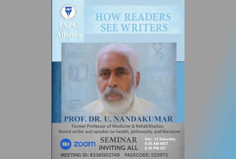 കാൽഗറി: ഇൻഡോ അമേരിക്കൻ പ്രസ് ക്ലബ് (I A P C ) ആൽബെർട്ട ചാപ്റ്റർ സംഘടിപ്പിക്കുന്ന വായനക്കാർ എഴുത്തുകാരെ എങ്ങനെ കാണുന്നു (How Readers See Writers ) എന്ന സെമിനാർ പ്രൊഫ. ഡോ. യു. നന്ദകുമാർ നയിക്കുന്നു. അദ്ദേഹം മുൻ മെഡിസിൻ & റീഹാബിലിറ്റേഷൻ പ്രൊഫസറാണ്. കേരളത്തിലെ ജനശാസ്ത്ര പ്രസ്ഥാനത്തിനും സാമൂഹിക ബോധവൽക്കരണ പ്രവർത്തനങ്ങൾക്കും അസാധാരണ സംഭാവന നൽകിയ പ്രശസ്ത വിദ്യാഭ്യാസ പ്രവർത്തകനും ചിന്തകനുമായ നന്ദകുമാർ കേരള ശാസ്ത്ര സാഹിത്യ പരിഷത്തിന്റെ (KSSP) മുഖ്യ നേതൃത്വത്തിൽ ദീർഘകാലം പ്രവർത്തിച്ചു് ശാസ്ത്രബോധം, യുക്തിചിന്ത, സാമൂഹിക ഉത്തരവാദിത്തം എന്നിവ ജനങ്ങളിൽ വളർത്താൻ ജീവിതം സമർപ്പിച്ച വ്യക്തിയാണ്. ഡിസംബർ 13 ശനിയാഴ്ച (8 .00 AM (M.S.T). 8 .30 P.M (I .S .T )) ഓൺലൈനിൽ സംഘടിപ്പിക്കുന്ന സെമിനാറിൽ പങ്കെടുക്കുവാൻ ആഗ്രഹിക്കുന്നവർ താഴെ കാണുന്ന ZOOM…