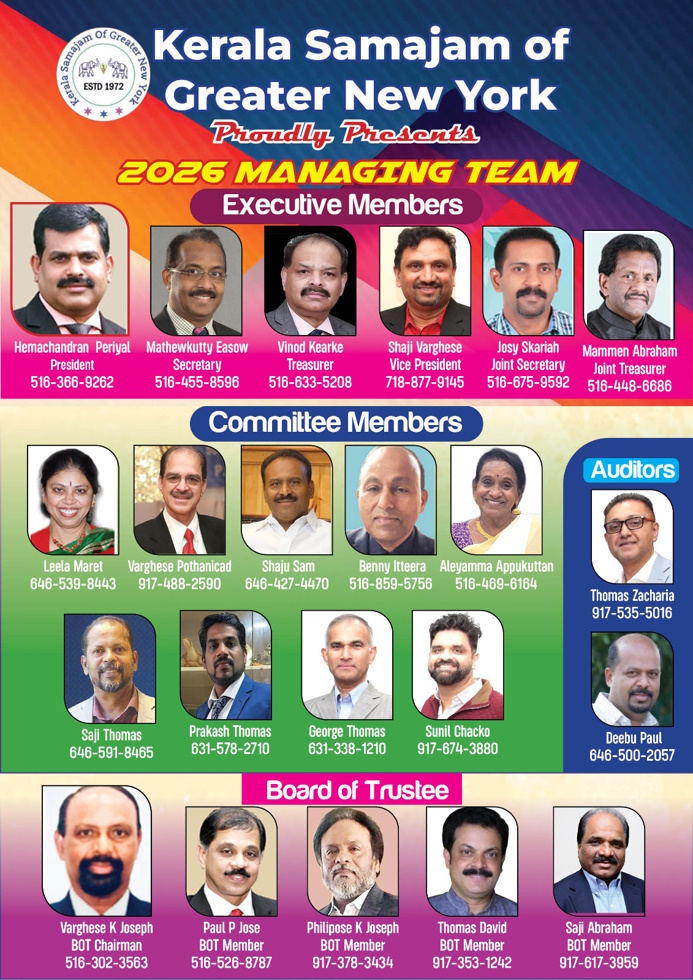 ന്യൂയോർക്ക്: അമേരിക്കയിലെ മലയാളീ സംഘടനകളുടെ മുത്തശ്ശി സംഘടന എന്നറിയപ്പെടുന്ന കേരളാ സമാജം ഓഫ് ഗ്രെയ്റ്റർ ന്യൂയോർക്കിൻറെ അൻപത്തിനാലാമത് വർഷത്തെ സാരഥ്യം ഏറ്റെടുക്കുന്നതിനായി നവ നേതൃത്വത്തെ വാർഷിക പൊതുയോഗം തെരഞ്ഞെടുത്തു. കഴിഞ്ഞ ശനിയാഴ്ച ഫ്ലോറൽ പാർക്കിലെ ടൈസൺ സെൻറർ ഓഡിറ്റോറിയത്തിൽ കൂടിയ വാർഷിക പൊതുയോഗത്തിൽ ഏകകണ്ഠമായാണ് പുതിയ ടീമിനെ തെരഞ്ഞെടുത്തത്. 2026-ലെ പ്രസിഡന്റായി ഹേമചന്ദ്രൻ പെരിയാൽ, സെക്രട്ടറിയായി മാത്യുക്കുട്ടി ഈശോ, ട്രഷററായി വിനോദ് കെആർക്കേ, വൈസ് പ്രസിഡന്റായി ഷാജി വർഗ്ഗീസ്, ജോയിന്റ് സെക്രട്ടറിയായി ജോസി സ്കറിയ, ജോയിന്റ് ട്രഷററായി മാമ്മൻ എബ്രഹാം എന്നിവരാണ് എതിരില്ലാതെ തെരഞ്ഞെടുക്കപ്പെട്ടത്. അതോടൊപ്പം തന്നെ ഒൻപത് കമ്മറ്റി അംഗങ്ങളും രണ്ട് ഓഡിറ്റർമാരും പുതിയ ഒരു ബോർഡ് ഓഫ് ട്രസ്റ്റീ അംഗവും തെരഞ്ഞെടുക്കപ്പെട്ടു. കമ്മറ്റി അംഗങ്ങളായി ലീലാ മാരേട്ട്, വർഗ്ഗീസ് പോത്താനിക്കാട്, ഷാജു സാം, ബെന്നി ഇട്ടീറ, ഏലിയാമ്മ അപ്പുകുട്ടൻ, സജി തോമസ്, പ്രകാശ് തോമസ്,…