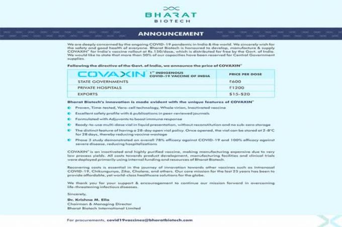 “ഇന്ത്യയുടെ വാക്സിൻ റോൾ ഔട്ടിനുള്ള വാക്സിൻ ഒരു ഡോസിന് 150 രൂപയ്ക്ക് വികസിപ്പിക്കാനും നിർമ്മിക്കാനും വിതരണം ചെയ്യാനും കമ്പനിക്ക് അഭിമാനമുണ്ട്. ഇത് സൗജന്യമായാണ് കേന്ദ്രം വിതരണം ചെയ്യുന്നത്,” ഐസിഎംആറിന്റെ നാഷണൽ ഇൻസ്റ്റിറ്റ്യൂട്ട് ഓഫ് വൈറോളജിയുമായി സഹകരിച്ച് കോവാക്സിൻ വികസിപ്പിച്ചെടുത്ത ഭാരത് ബയോടെക് ഒരു പ്രസ്താവനയിൽ പറഞ്ഞു.