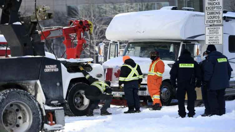 Tow truck operators — wearing neon-green ski masks, with their companies’ decals taped over on their trucks to conceal their identities — arrived under police escort and set to work removing the big rigs, campers and other vehicles parked bumper to bumper and shoulder to shoulder near Parliament.