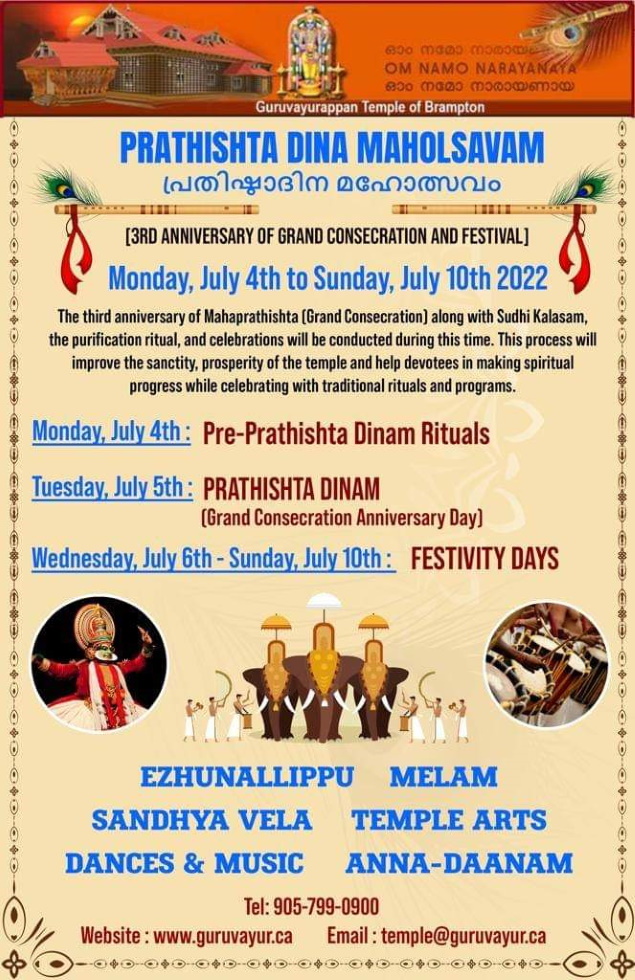 Guruvayurappan Temple of Brampton will be celebrating the third anniversary of the Pratishta Dinam from the 4th of July to the 10th of July 2022. It is a Maholsavam celebrated with much pomp and joy and inspiring devotion and surrender to the supreme lord Krishna.