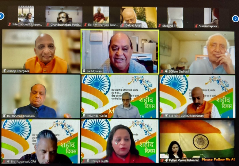 GOPIO International President Lal Motwani speaking at the Shaheed Diwas with GOPIO Organizers on the screen: Top Row, from l. to r. Anoop Bhargava, Lal Motwani, Ram Gadhavi, Middle Row: From l. to r. Dr. Thomas Abraham, Shivender Sofat. Siddarth Jain; Bottom Row, from l. to r.: Braj Agrawal, Bhavya Gupta and Pallavi Verma Belwariar