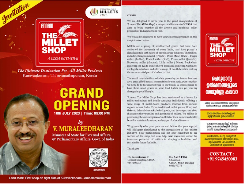 Thiruvananthapuram: The Center for Innovation in Science & Social Action (CISSA) is set to launch ‘Annam The Millet Shop’ in Thiruvananthapuram, offering a diverse range of Millet related products sourced from more than fifty reputable companies across the country. The inauguration ceremony will take place at Kurvankonam, Thiruvananthapuram on July 10th at 5 pm, with Union Minister of State for External Affairs and Parliamentary Affairs, V. Muraleedharan, serving as the chief guest.