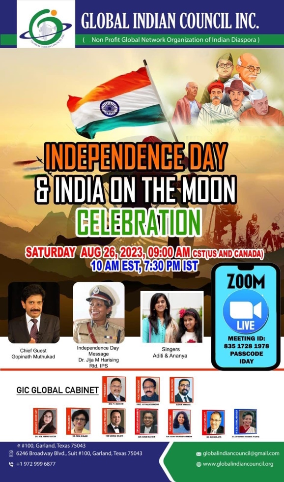 Las Vegas: The Independence Day celebration of the Global Indian Council was held on August 26, 2023, CST at 9:00 AM on a Zoom platform comprising leaders from across the world. It was a great meeting with lasting excitement of Chandrayaan 3 victory that took place during the time frame just after the 76th Independence Day celebration. Global Indian Council President PC Mathew presided over the meeting and Global General Secretary delivered a detailed welcome speech. Dr. Gopinath Muthukad as the Chief Guest and Dr. Jija Madhavan Hari Singh IPS, Rtd. (Global Goodwill Ambassador of GIC) graced the event with their valuable presence.