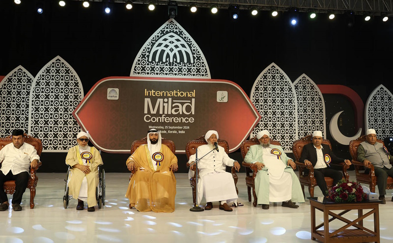 A major highlight of the event was the traditional Prophetic Praise (Mawlid) gathering led by the renowned Al Malid singing group from Fujairah, UAE which captivated the audience. The proceedings began with a grand procession of around 100 Daff groups at 4:00 PM. Markaz President Sayyed Ali Bafaqi Thangal led the opening prayer, while Samasta Kerala Jamiatul Ulema President E. Sulaiman Musliar presided over the event.